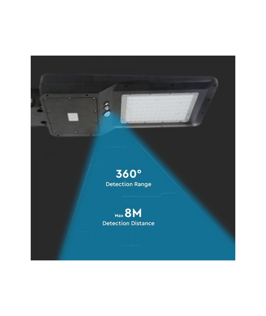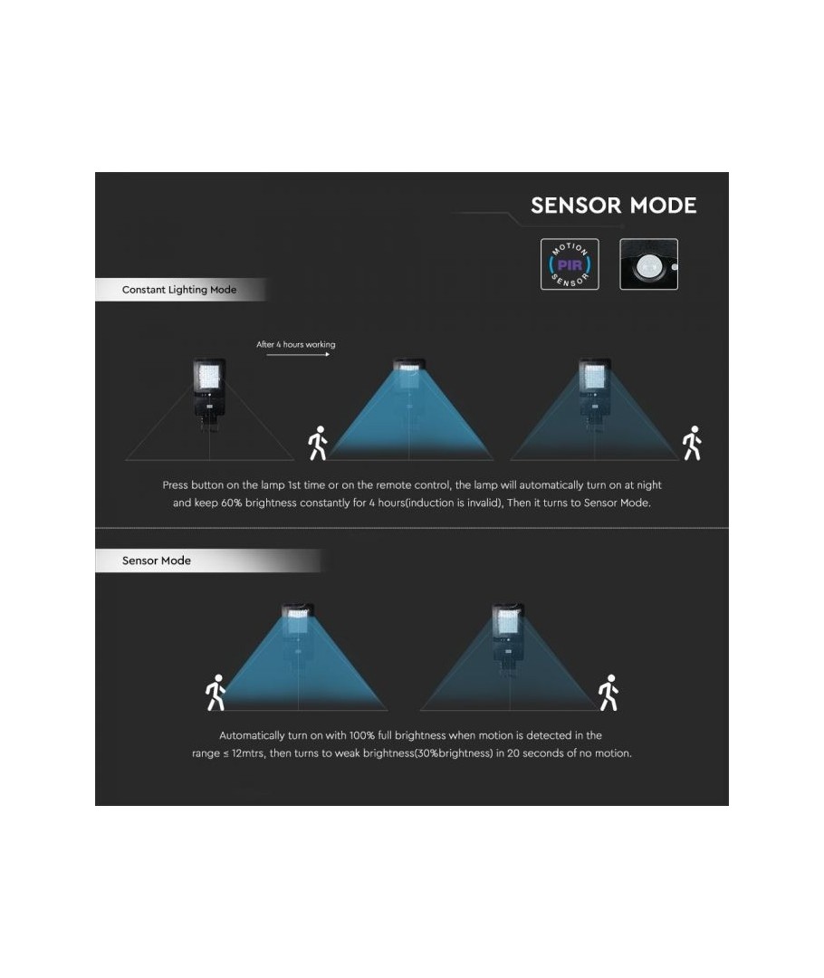 Den integrerade solcellen och den smidiga fjärrkontrollen gör denna LED-gatulampa både praktisk och energieffektiv, medan sensorteknologi optimerar energiutnyttjandet genom att reglera ljusstyrkan automatiskt.