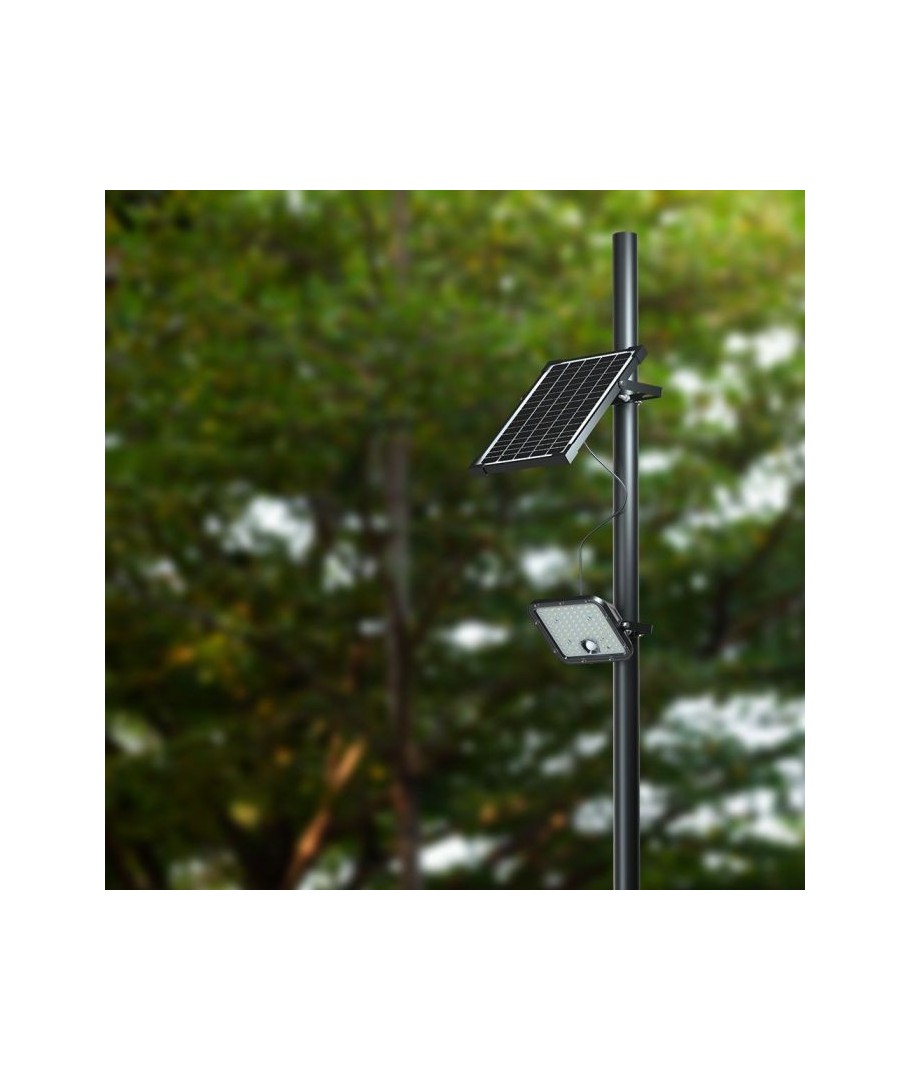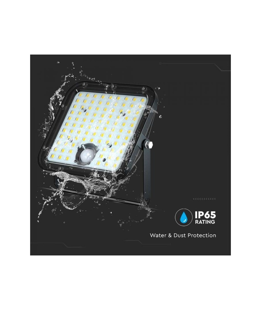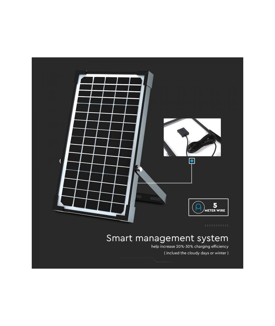 V-Tac 30W LED Solar strålkastare - Svart, en praktisk och energieffektiv lösning för utomhusbelysning. Denna strålkastare inkluderar en solcell och fjärrkontroll och är designad för att klara alla väderförhållanden med sin IP65-klassning. Den har även en praktisk timerfunktion som låter dig ställa in den så att den släcks automatiskt efter en viss tidsperiod. Med en full laddningstid på endast 4-6 timmar kan denna projektor ge 60 timmars ljus. Den kommer också med en sladd, vilket ger dig flexibiliteten att placera den där du behöver den.