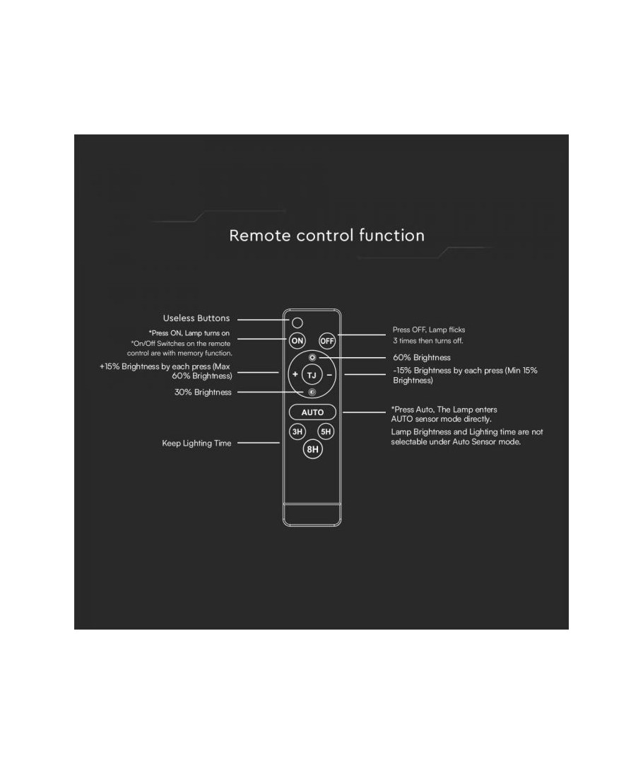 Den integrerade ljuskällan säkerställer en enkel och problemfri installation, samtidigt som fjärrkontrollen gör det lätt att justera ljusstyrkan efter behov. Tack vare solcellsfunktionen är den också miljövänlig och energisnål, vilket gör den till ett hållbart val för både privata och kommersiella ändamål.