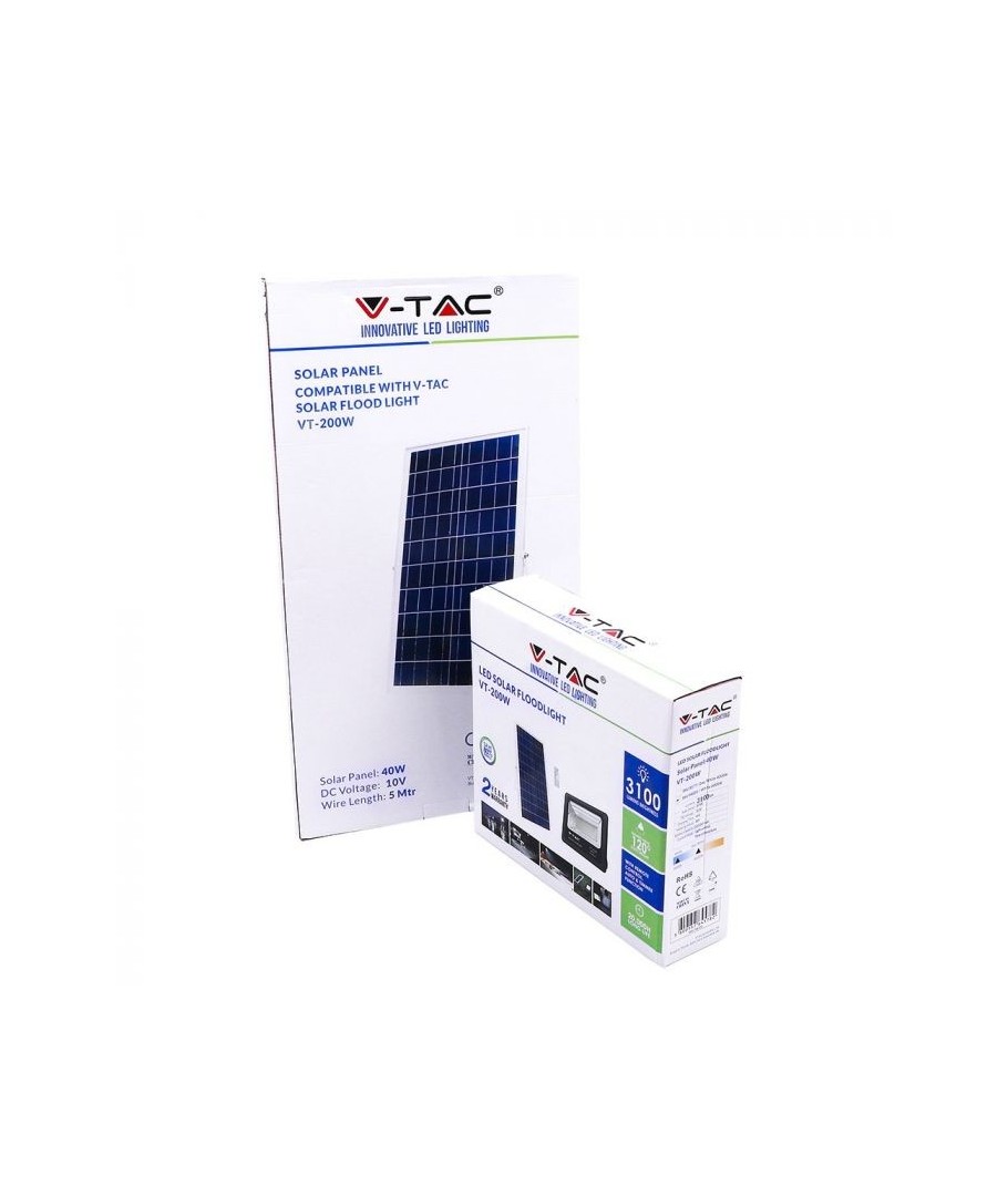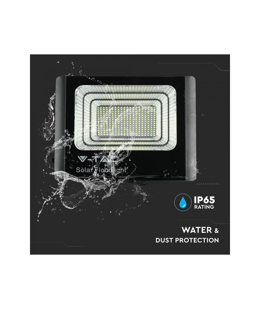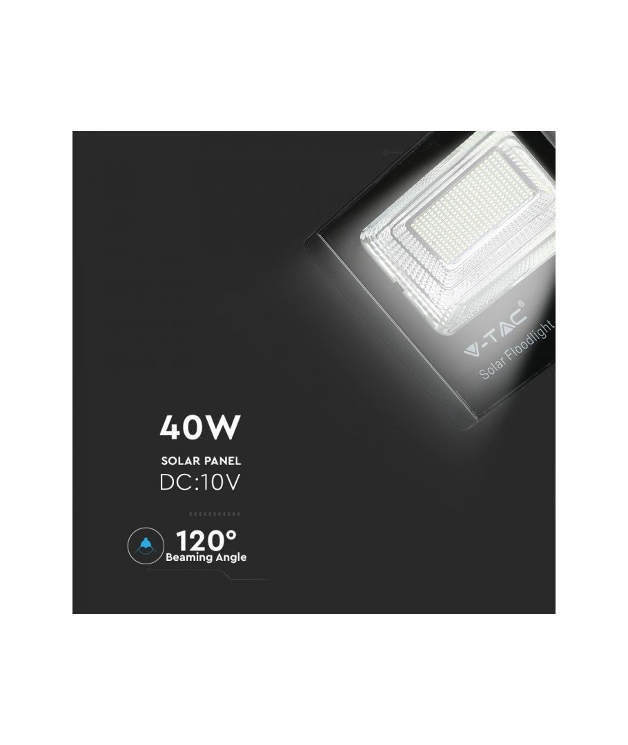 V-Tac 40W LED Solar strålkastare - Svart, en praktisk och energieffektiv lösning för utomhusbelysning. Denna strålkastare inkluderar en solcell och fjärrkontroll och är designad för att klara alla väderförhållanden med sin IP65-klassning. Den har även en praktisk timerfunktion som låter dig ställa in den så att den stängs av automatiskt efter en viss tidsperiod. Med en full laddningstid på endast 4 timmar kan denna projektor ge 8 timmars ljus. Den kommer också med en 5 meter lång sladd, vilket ger dig flexibiliteten att placera den där du behöver den.