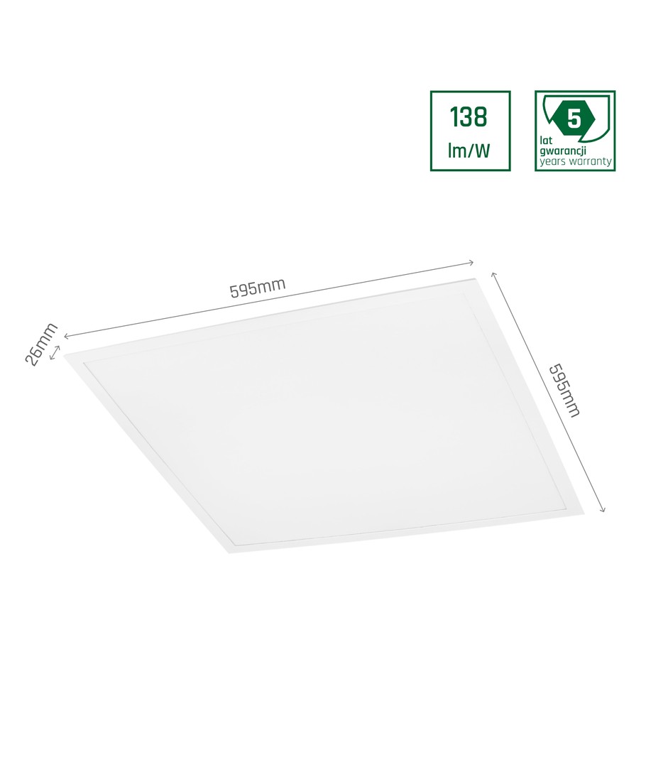 Panelens kompakta dimensioner på 595 x 26 x 595 mm och hålstorlek på 575 mm gör den lätt att installera i olika miljöer. Den har en vit kant som smidigt smälter in i olika interiörer.