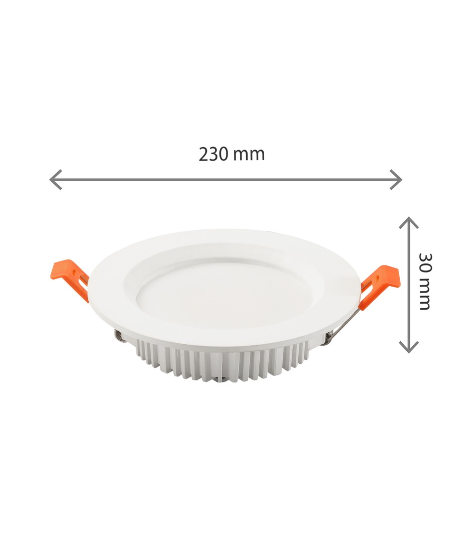 Denna downlight-panel erbjuder en effekt på 28W och är utformad för att anslutas direkt till 230V. Med en ljusstyrka på 2300 lumen och en bred spridningsvinkel på 110 grader säkerställs en jämn och effektiv belysning som skapar en behaglig miljö.