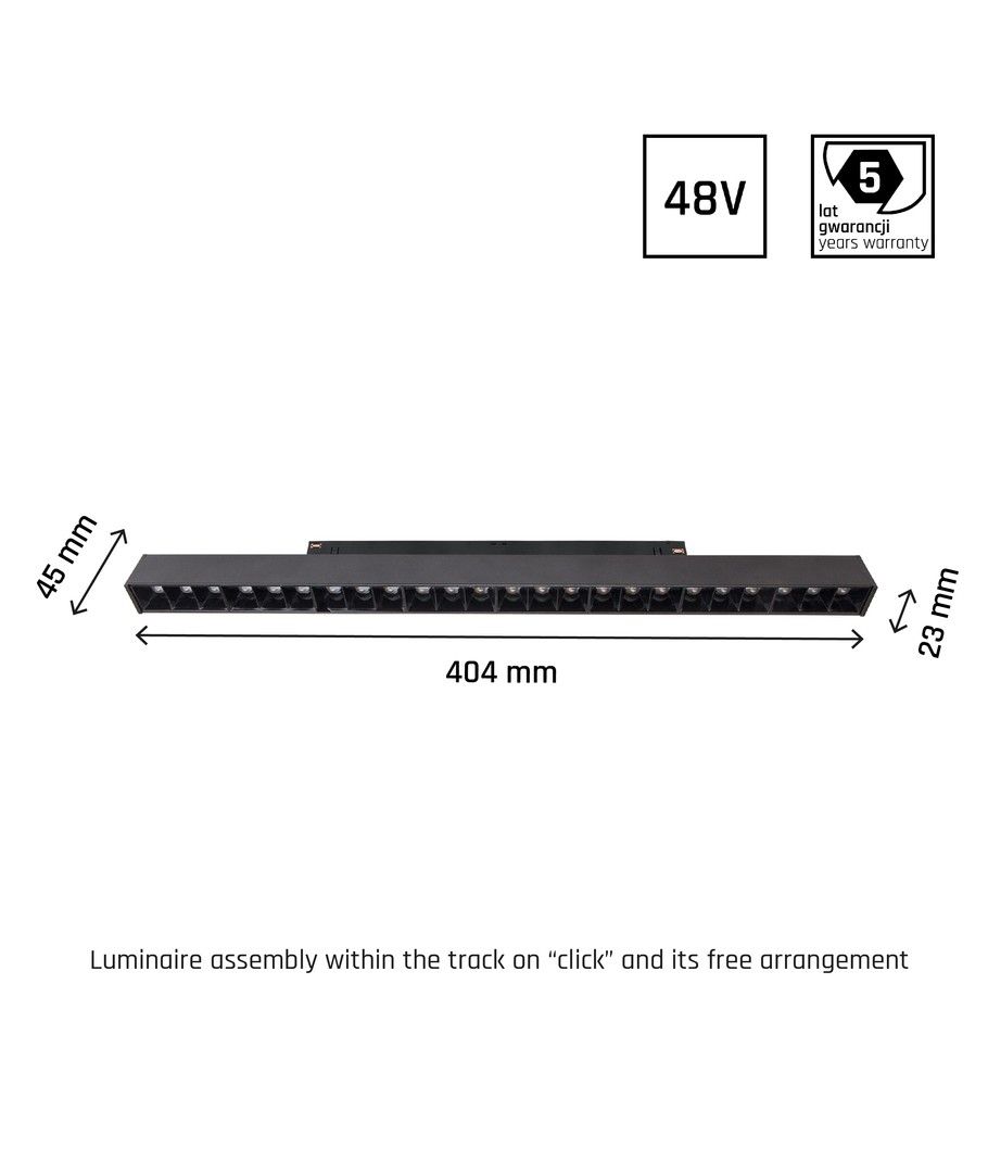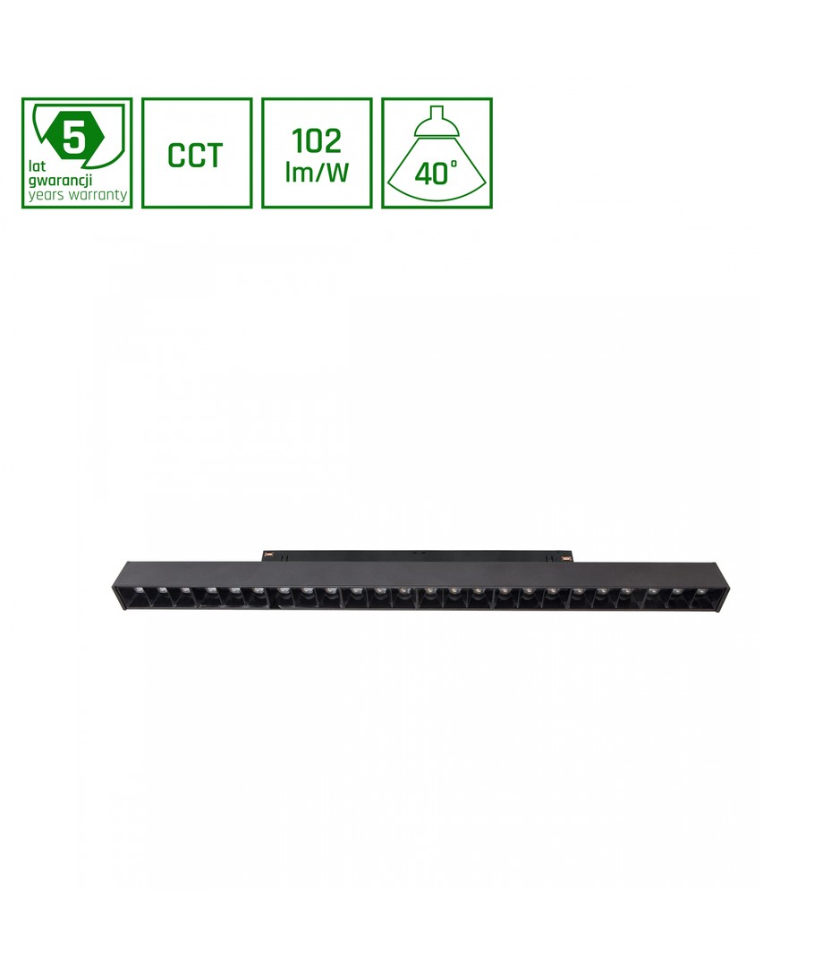 Med en effekt på 22W och en anslutning till 48V DC, ger denna LED skenspot en ljusstyrka på 1200 lumen. Ett fokuserat ljus på 40 grader säkerställer en kontrollerad ljusspridning.