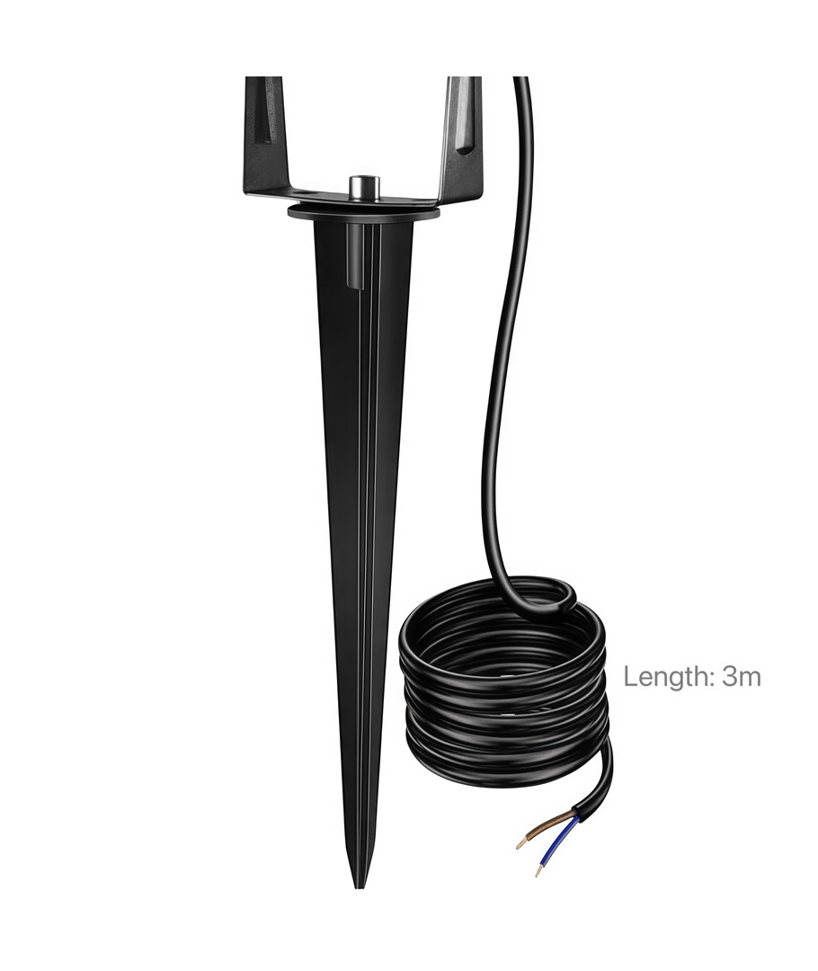 Med dimensioner på 150 x Ø100 mm, är denna lampa kompakt men effektiv. För enkel installation är den utrustad med ett spjut som gör den enkel att placera i marken.