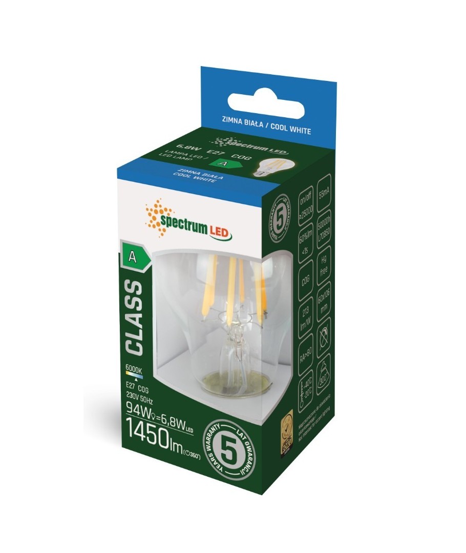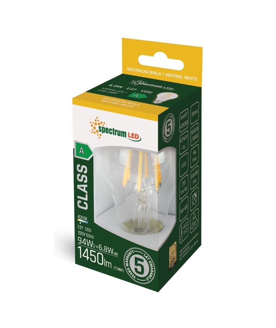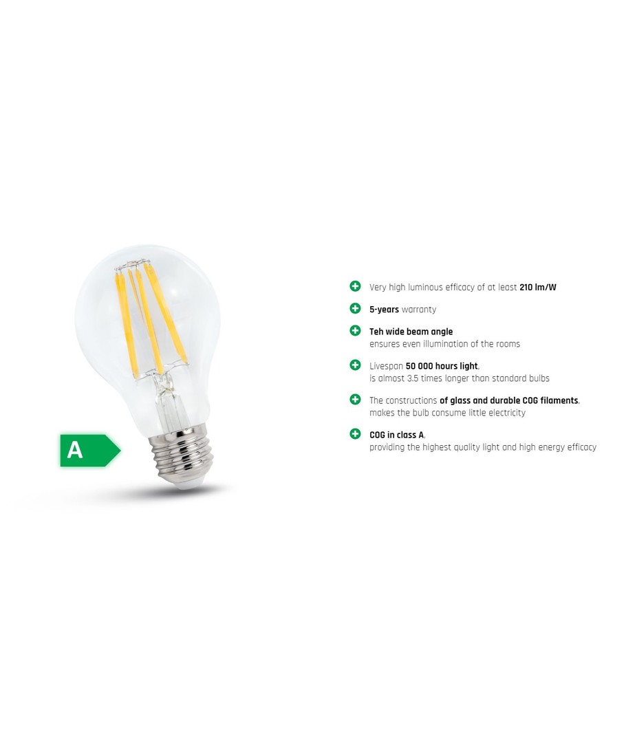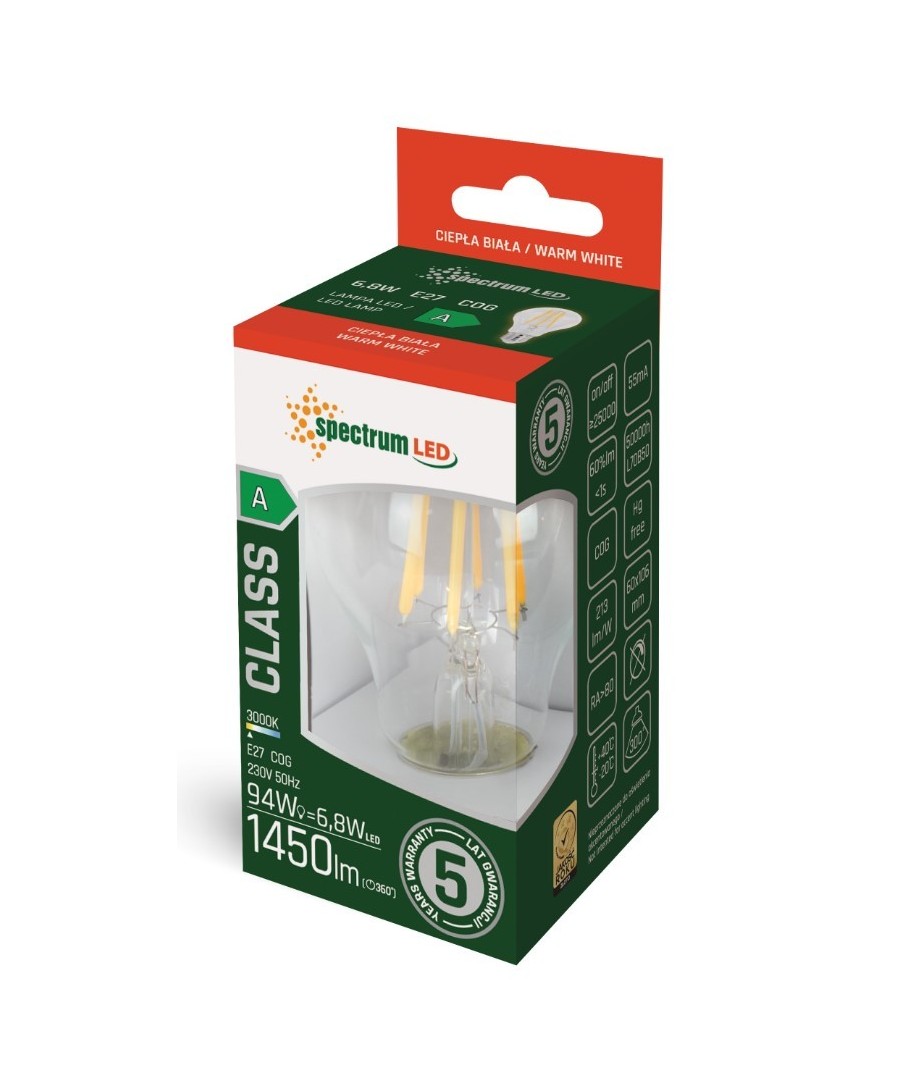 Spectrum 6,8W LED lampa - 213 lm/W, A60, filament, klart glas, E27 Spectrum5y Expandera