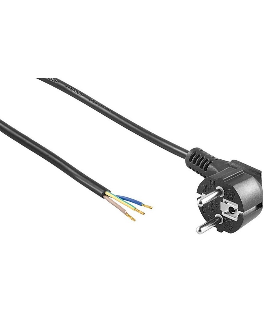 1,5 meter svart strömkabel med schuko-plugg och strippade ledningar.