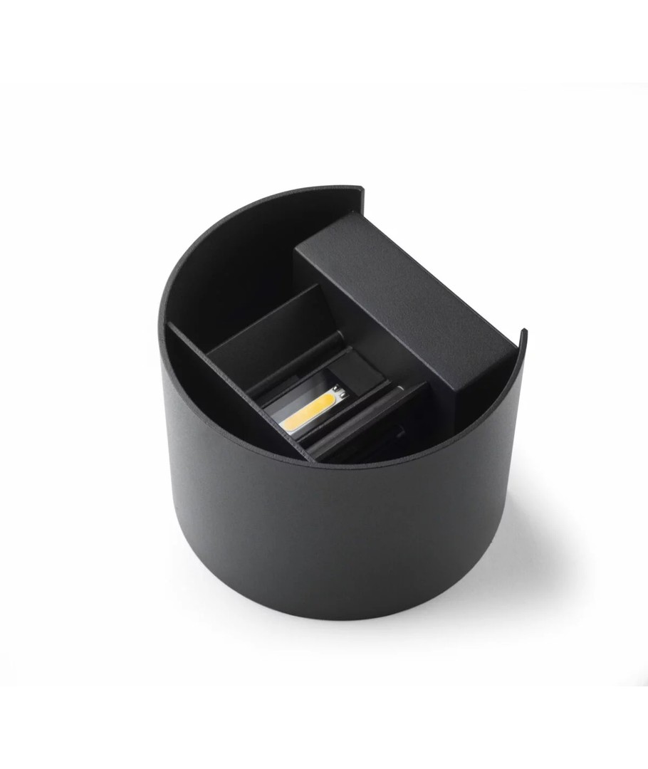 Modern och stilren utomhus LED vägglampa i svart, som är halvrund med flera inställningsmöjligheter. Lampan kan riktas och ljusmängden justeras efter eget önskemål. (0-100 grader spridningsvinkel på ljuset)