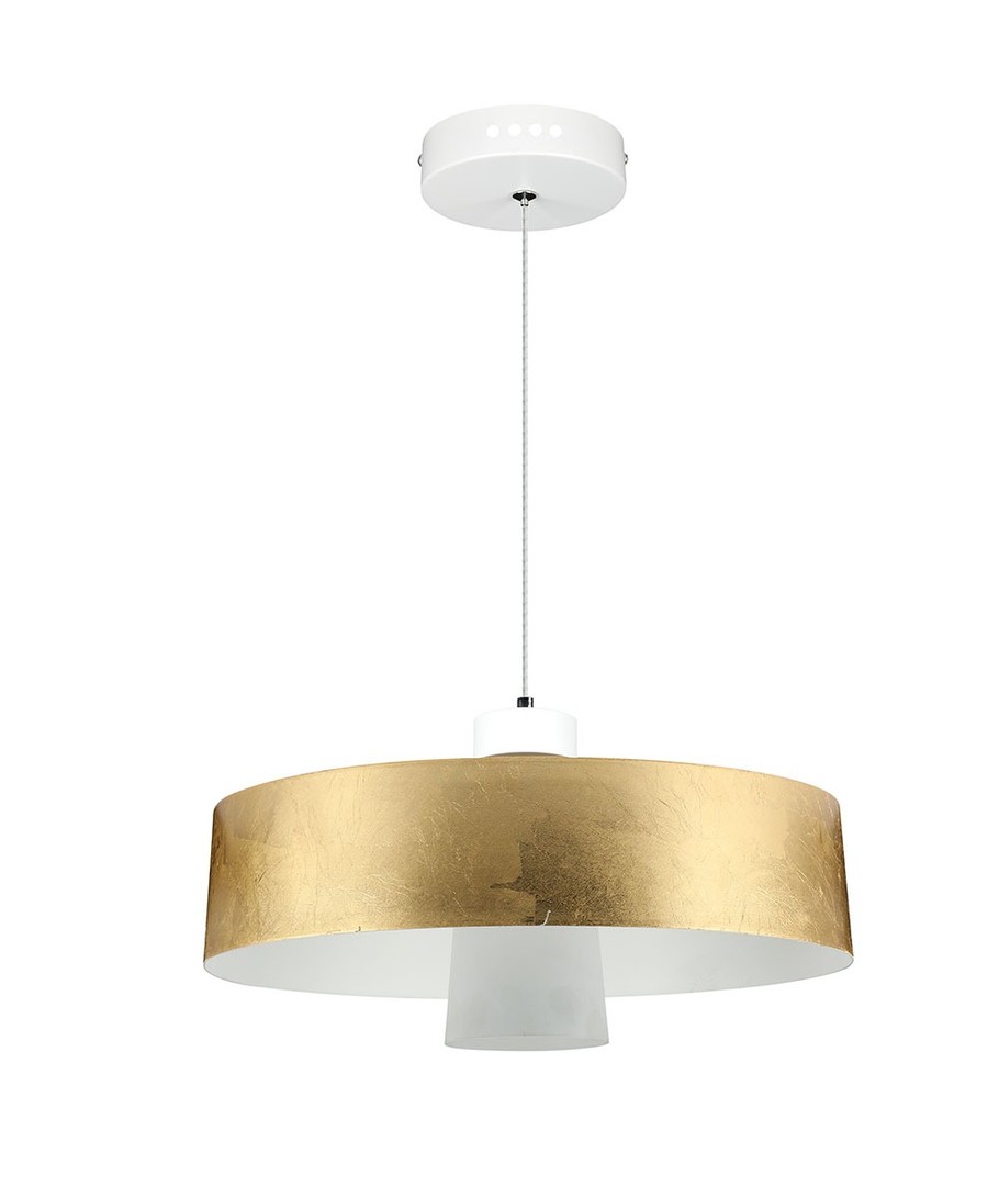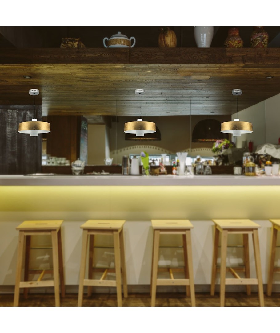 Designad för att ge ett varmvitt sken, skapar denna pendellampa en avkopplande och varm atmosfär i ditt hem eller kontor. Med en stilren guld lampskärm i akryl, fungerar lampan både som en ljuskälla och en estetisk detalj i ditt rum.