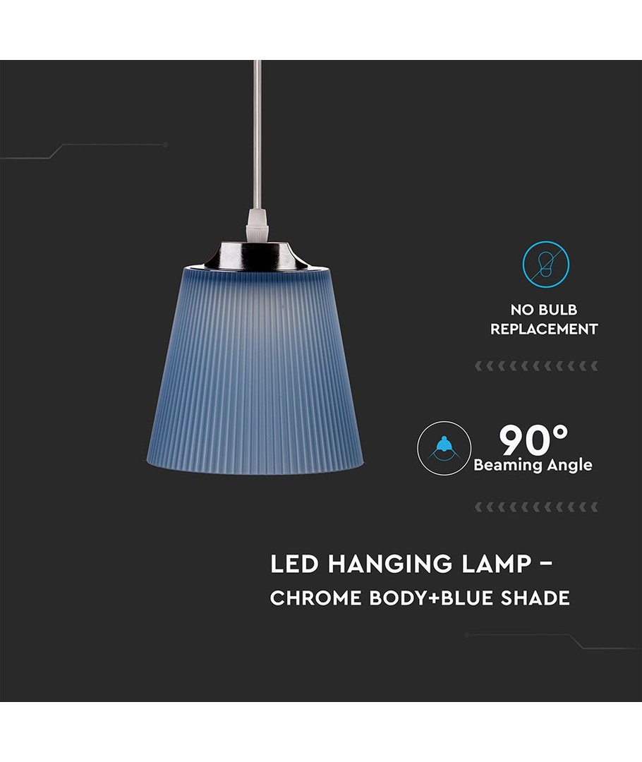 Den krominfattade armen och blåa skärmen ger denna taklampa ett modernt och stilrent utseende. Dessa materialval säkerställer inte bara hållbarhet utan tillför också ett sofistikerat element till din inredning.