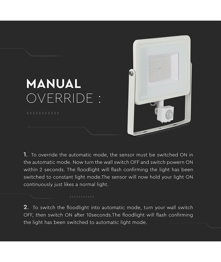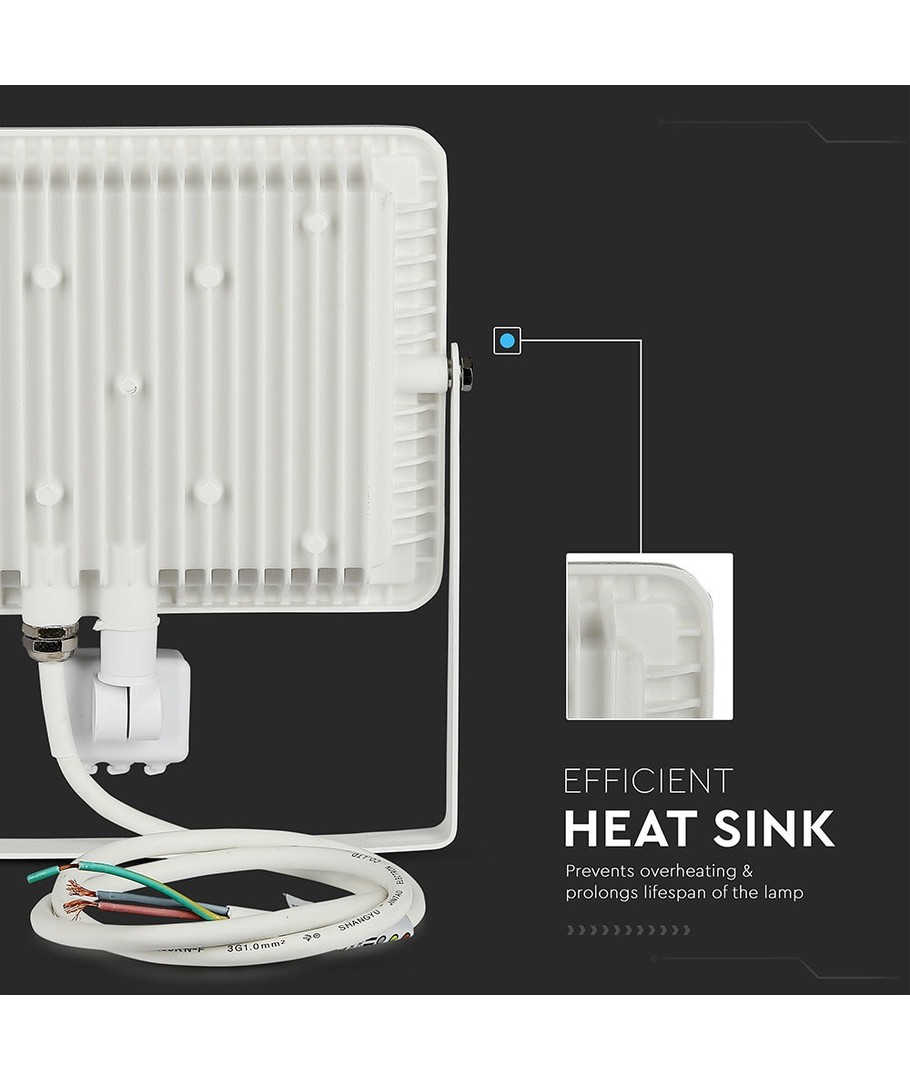 Designad i ett stilrent vitt hölje, har strålkastaren en kompakt storlek med måtten 234.3 x 57.06 x 223 mm. Den har en IP65-klassning, vilket gör den perfekt för utomhusbruk, då den står emot både vattenstänk och regn.