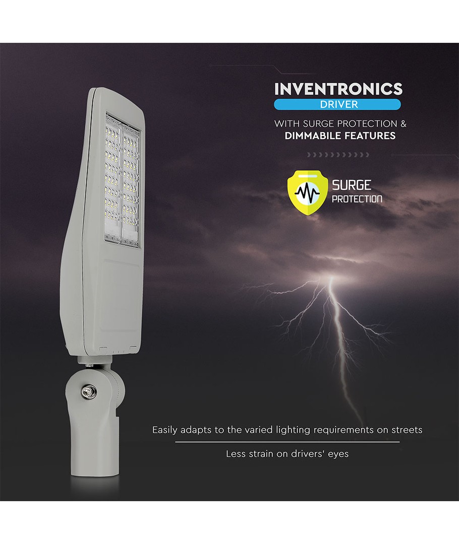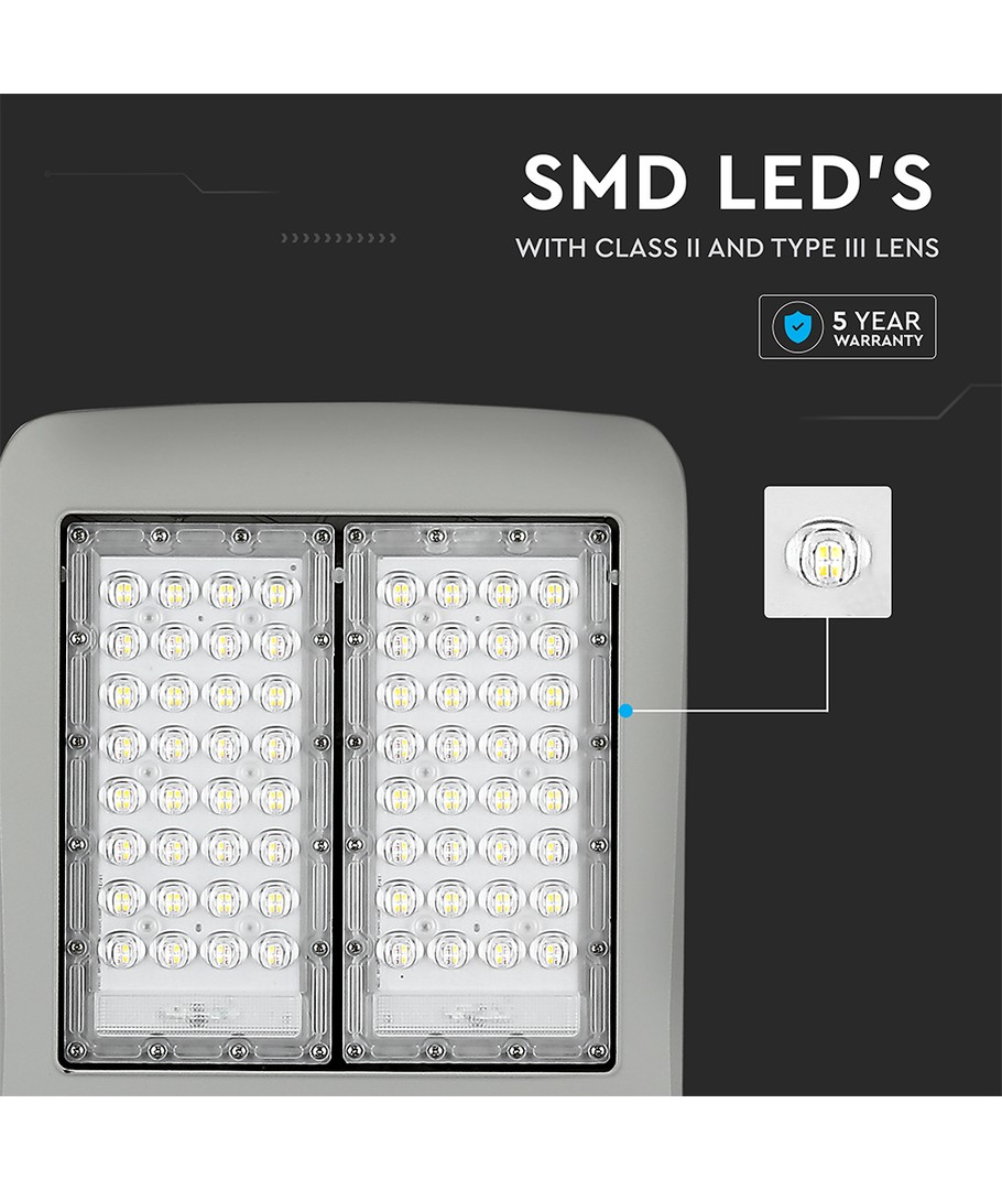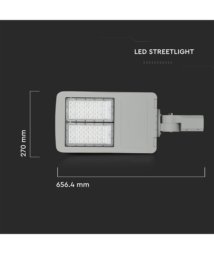 Med en effekt på 120W ger denna LED gatlampa en kraftfull ljusstyrka på 16800 lm. Med sin breda spridning på 153/70 grader säkerställs en jämn fördelning av ljuset i alla riktningar.
