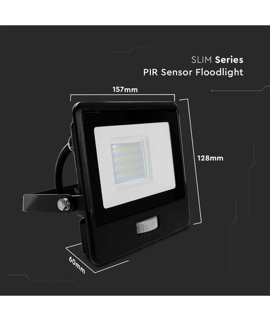 Den svarta strålkastaren har ett stilrent och robust utseende med dimensionerna 157 x 60 x 128 mm. Den är designad för utomhusbruk och är klassificerad som IP65, vilket betyder att den är resistent mot vattenstänk och regn.