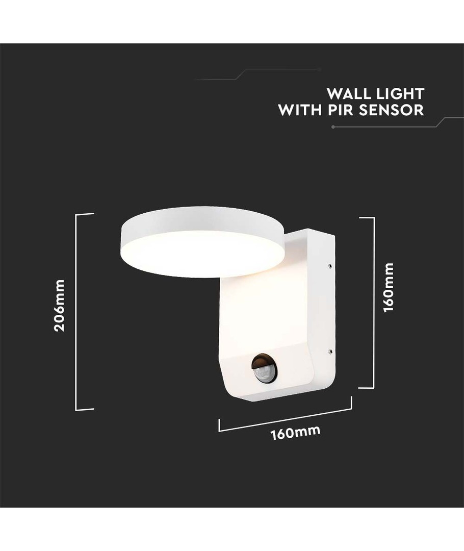 Lampans dimensioner är 206 x 160 x 160 mm, vilket gör den diskret men ändå effektiv i sin belysning. Den vita, runda höljet passar de flesta exteriörer och ger ett stilrent utseende.