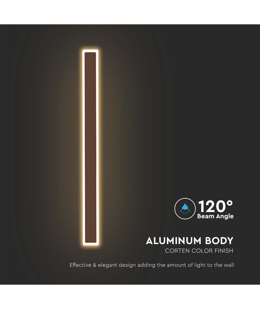 Denna moderna vägglampa kombinerar stil och funktionalitet genom sitt avlånga Corten-design. Perfekt både för inomhus och utomhusbruk, tack vare sin robusta konstruktion och IP65-klassning som tål vattenstänk och regn.
