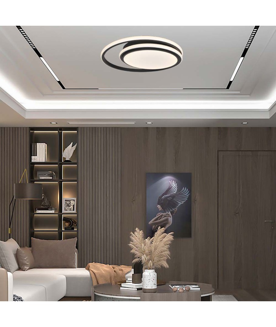Lampans dubbelrundade form och eleganta svarta färg passar sömlöst in i modern inredning och förhöjer stilnivån i vilket rum som helst. Den är designad för enkel och säker montering i tak eller på vägg.