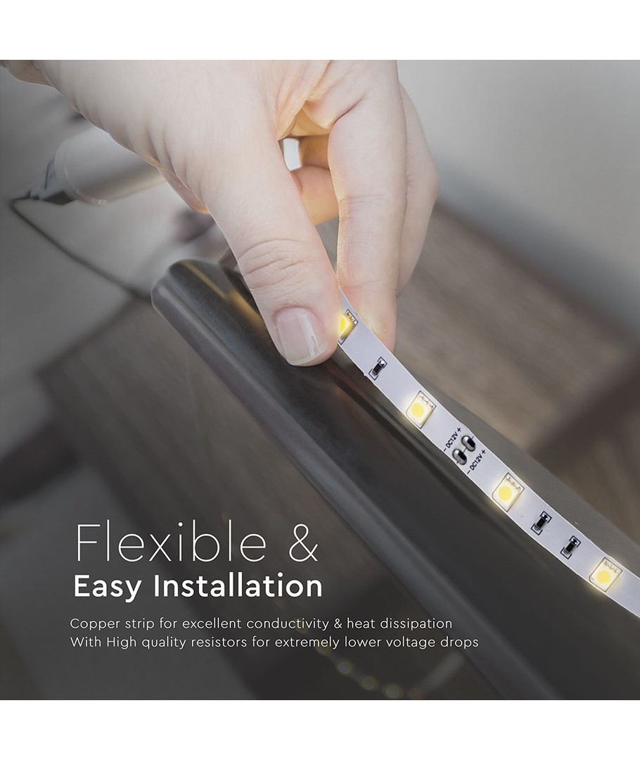 LED-remsan finns i en varmvit färg (3000K), vilket ger en mjuk och inbjudande känsla. Den varma färgtonen är perfekt för att skapa en avkopplande atmosfär där du vill njuta av det komfortabla skenet.