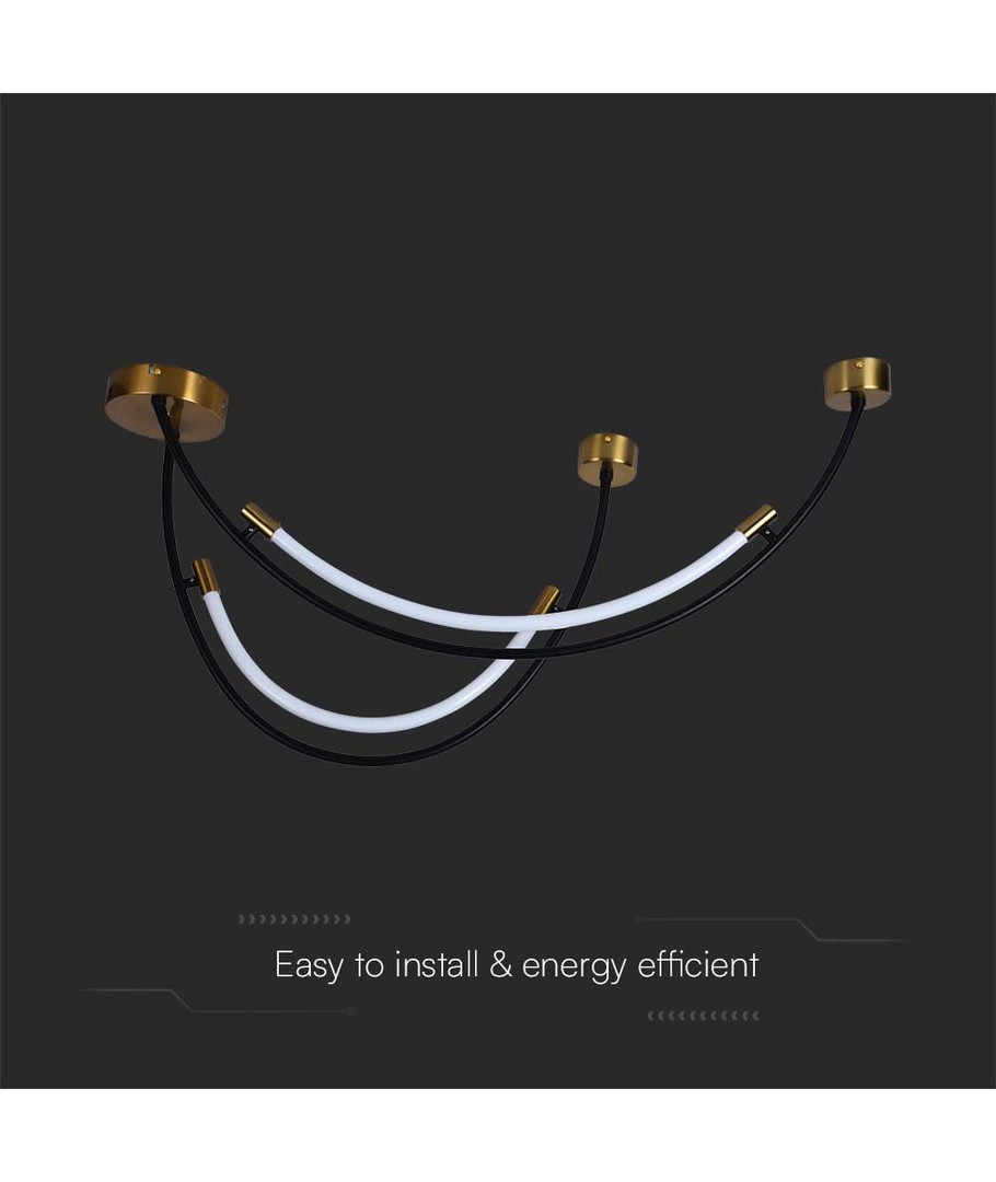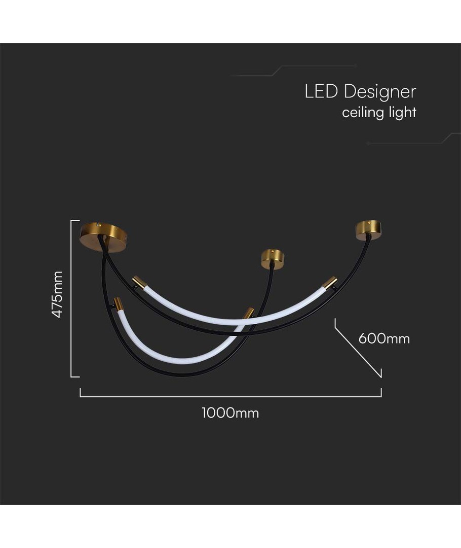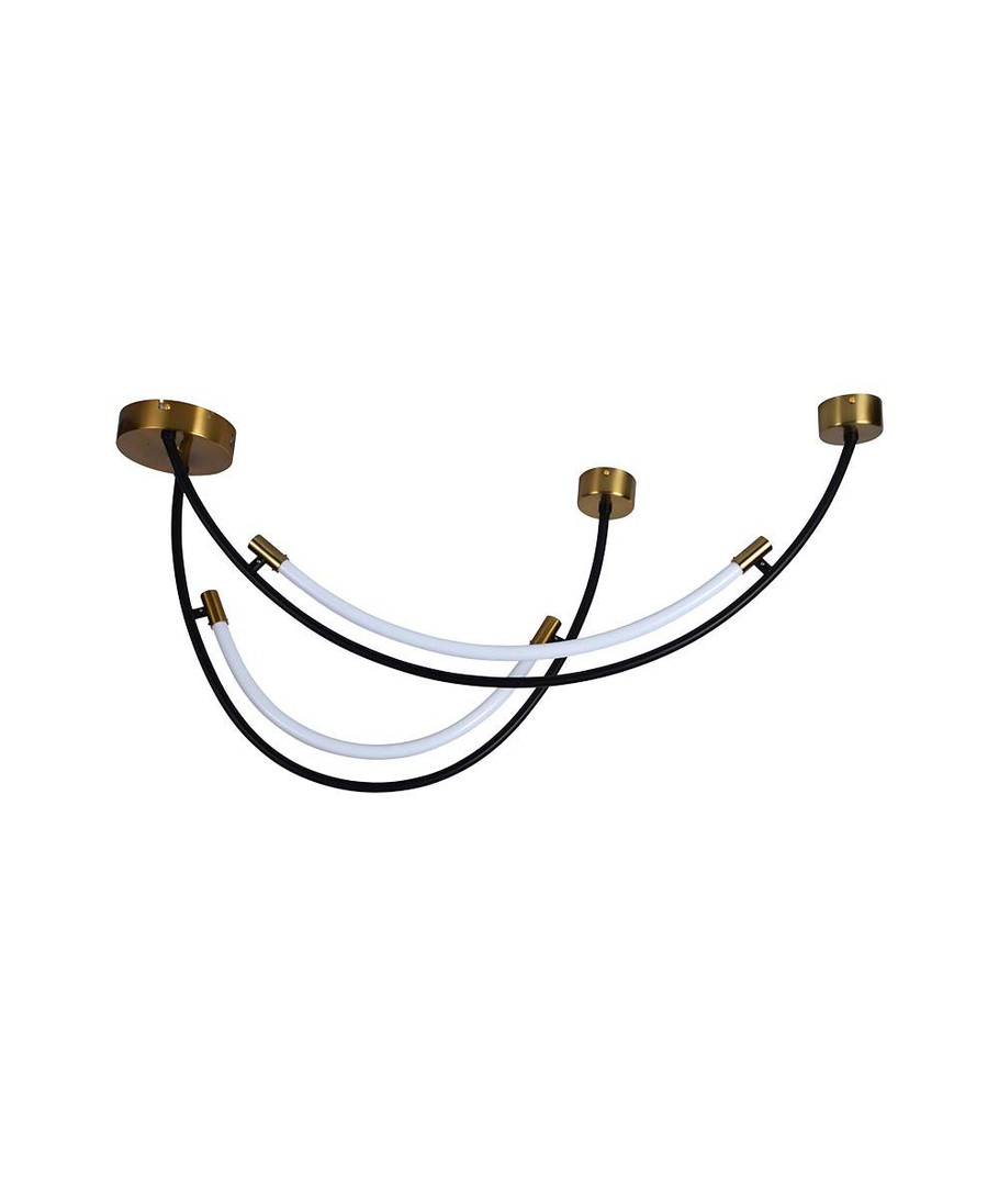 Den eleganta designen kombinerar svart och mässing, vilket ger en sofistikerad touch till alla rum. Lampan är 1000 mm lång och 600 mm hög, vilket gör den till en perfekt statement-pjäs i ditt vardagsrum eller matsal.