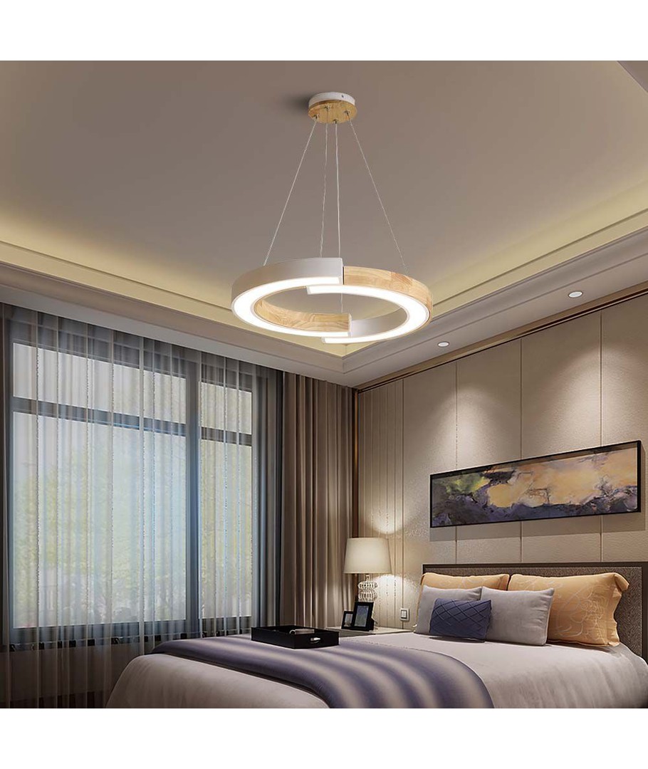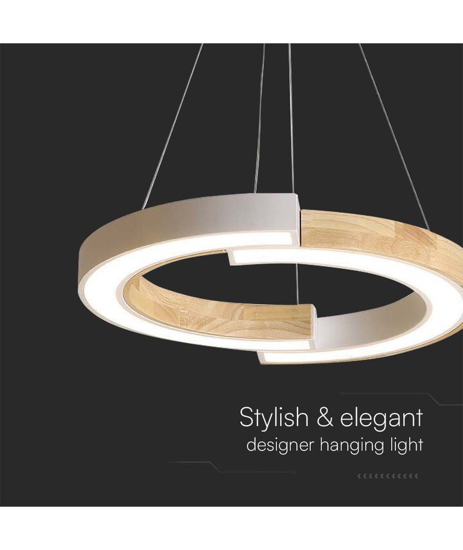 Med en elegant kombination av vit och trä, passar denna hänglampa sömlöst in i de flesta interiörer. Lampans dimensioner är 1120 x 370 x 430 mm, vilket gör den till ett iögonfallande inslag i rummet utan att vara överväldigande.