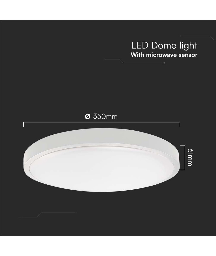 Dess runda design med en vit ram har måtten 350 x 61 mm. Produkten är utformad för enkel integration i olika utrymmen, samtidigt som den behåller en minimalistisk och modern estetik.