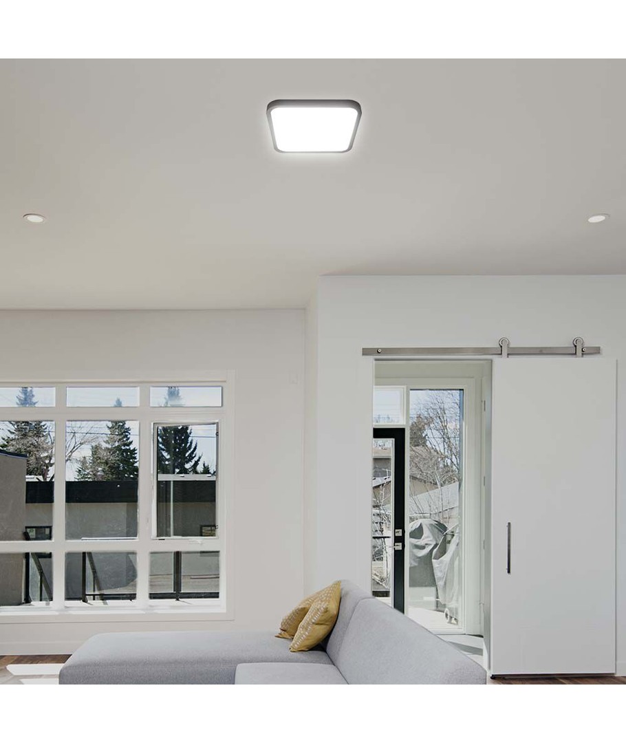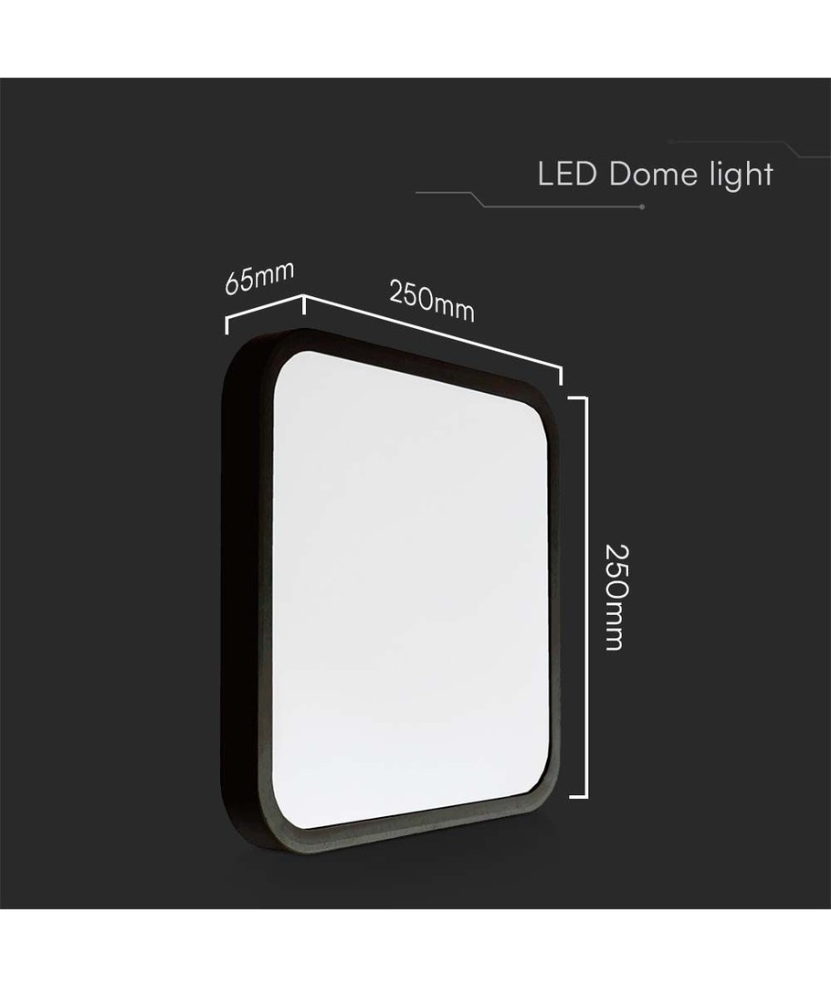 Lampans dimensioner är 250 x 65 x 250 mm, vilket gör den kompakt och lätt att integrera i olika typer av tak. Dessutom har den en certifierad IP44-klassning, vilket gör att den klarar fuktig luft och vattenstänk, perfekt för användning i badrum och kök.