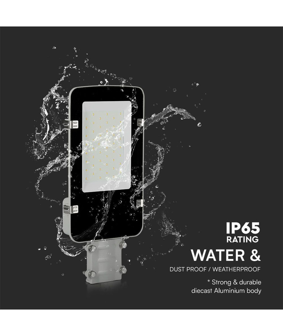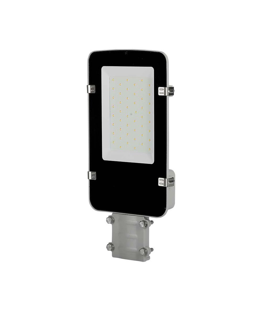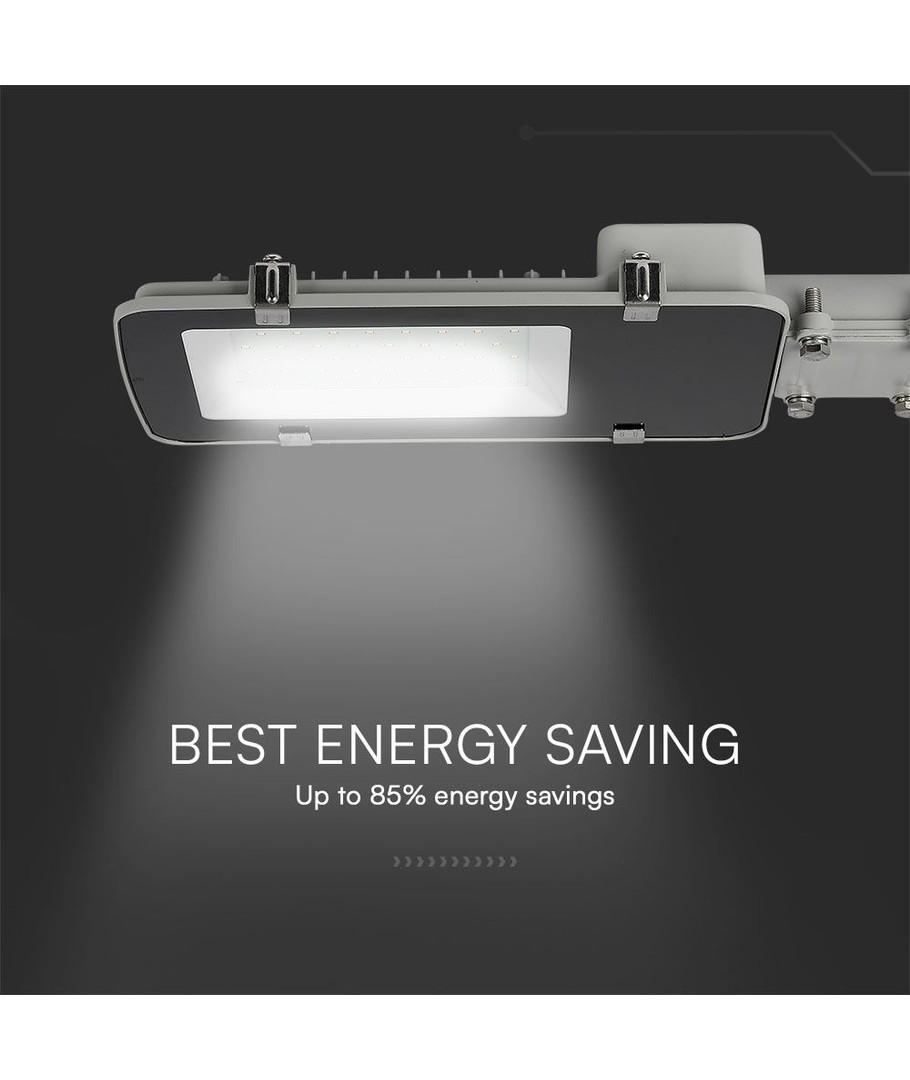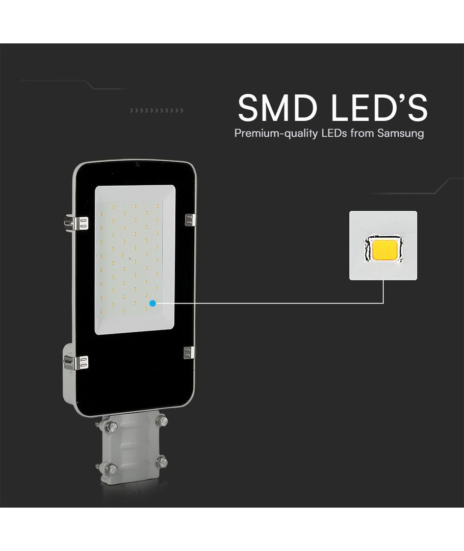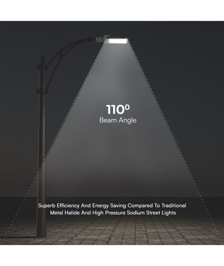 Denna LED-gatubelysning erbjuder hög ljuskvalitet och lång hållbarhet tack vare integrerade Samsung LED-chip och en effekt på 50W. Med en ljusstyrka på 5750 lm och en bred spridning på 110 grader säkerställer den en jämn ljusfördelning som täcker stora områden effektivt.