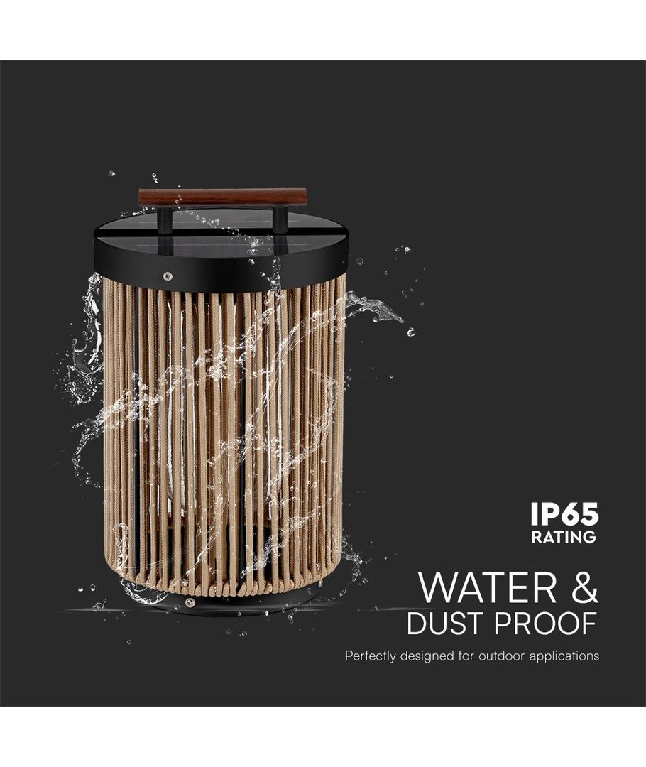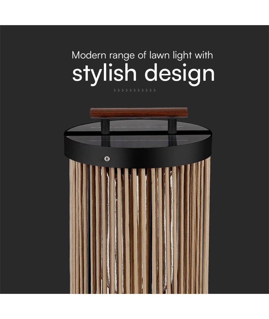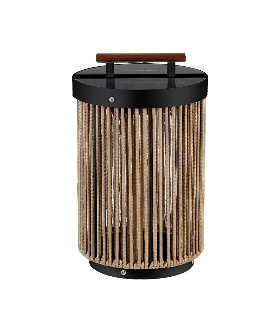 Designen inkluderar ett stilrent svart yttre med ett hantag av hampa, kompletterat med ett elegant trähandtag. Detta inte bara förhöjer lampans estetiska värde men gör den också lätt att flytta runt efter behov.