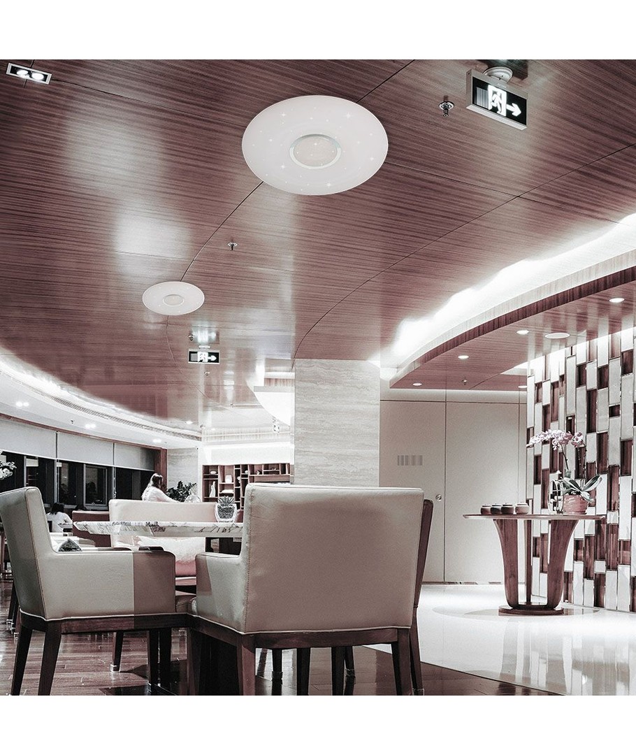 Lampan är utrustad med en fjärrkontroll för enkel hantering, vilket låter dig justera ljusstyrkan enligt dina behov tack vare dess dimbar funktion. Dess CCT-växling möjliggör en smidig anpassning av ljusets färgtemperatur för att skapa rätt stämning i alla situationer.