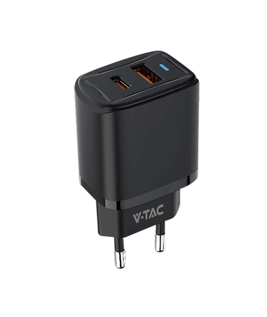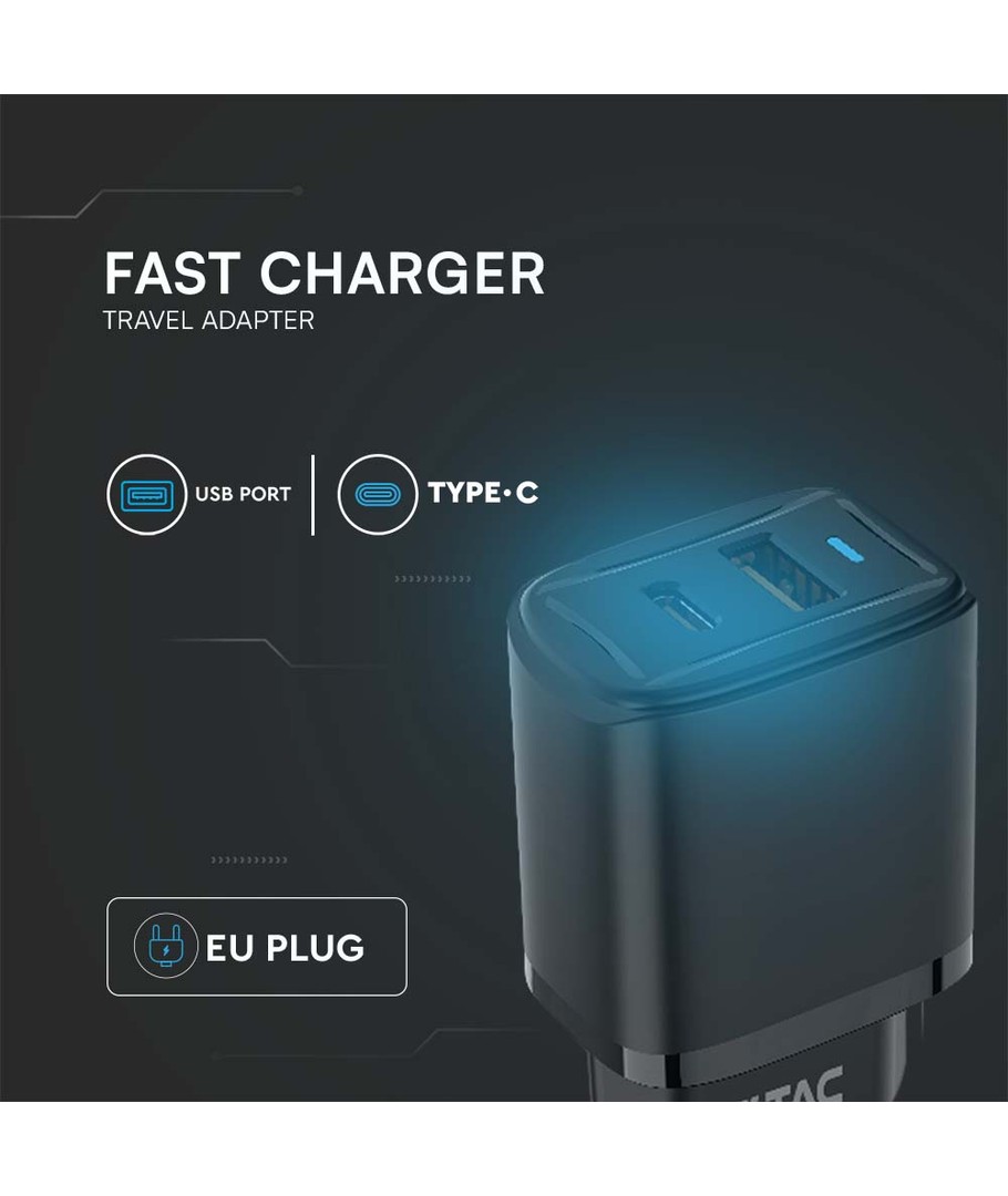 20W USB reseadapter med PD och QC - Svart, snabbladdare, 1x USB-A och 1x USB-C PD V-TAC Expandera