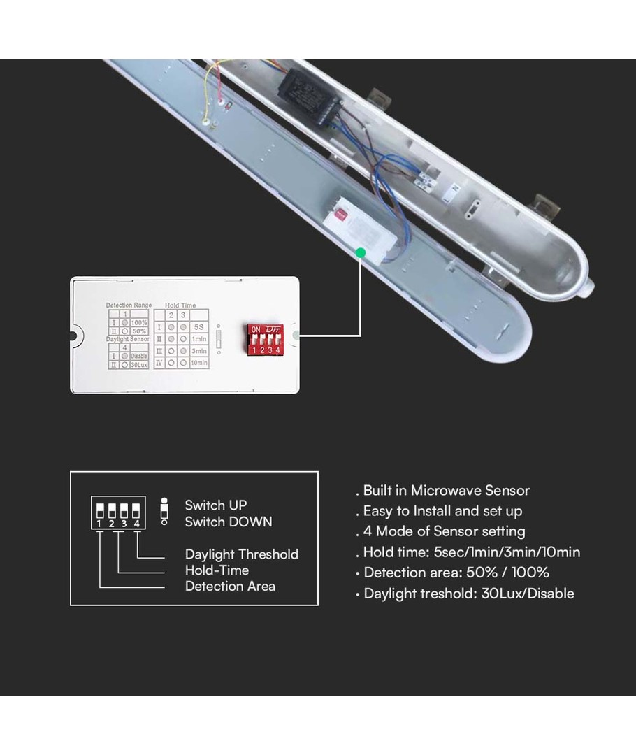 | Yderligere bemærkninger | Max in series: Upto 10 Units. Light-on duration: 5s, 1 min, 3 min, 10 min. Sensor type: Microwave. Sensor distance: 4-10 Meters. Ambient light level: 30 Lux/Disable. |
