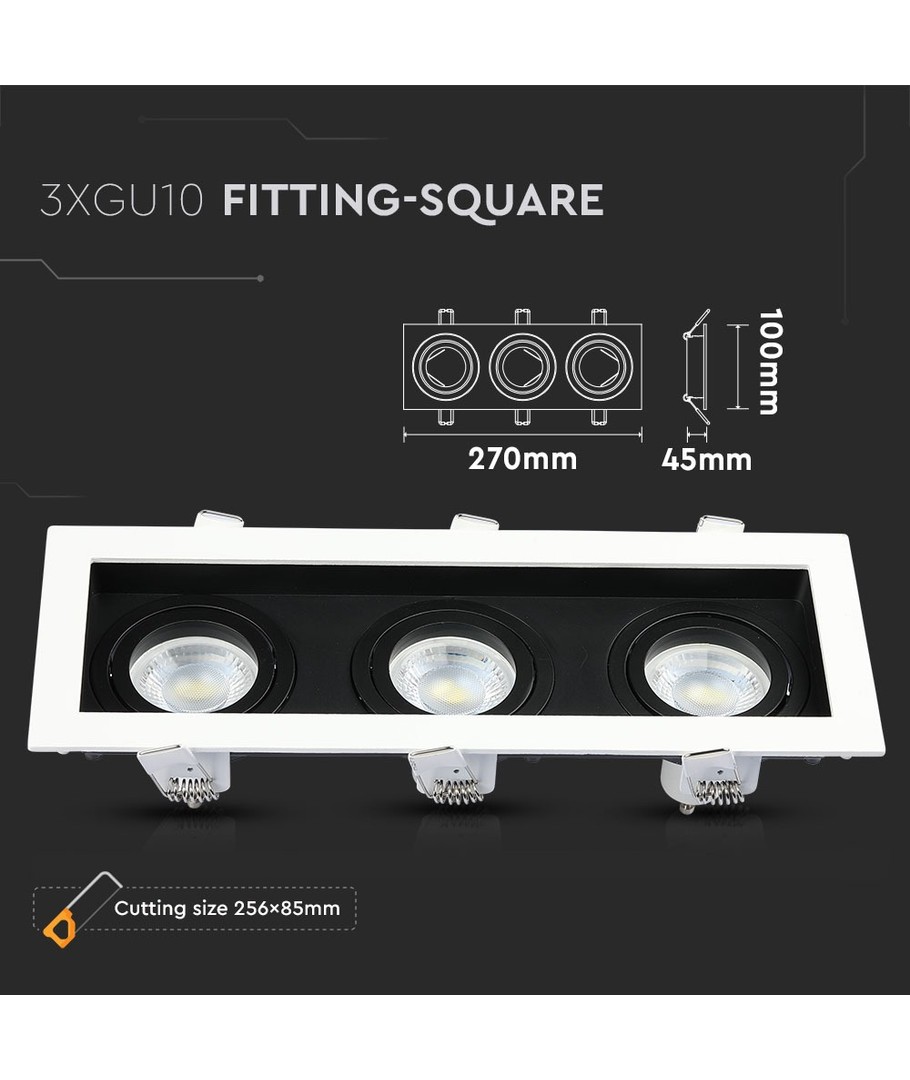 Med en hålstorlek på 256x85 mm underlättas installationen i olika tak och väggar. Den fyrkantiga formen gör det enkelt att placera flera enheter i linje för ett enhetligt och elegant belysningssystem.