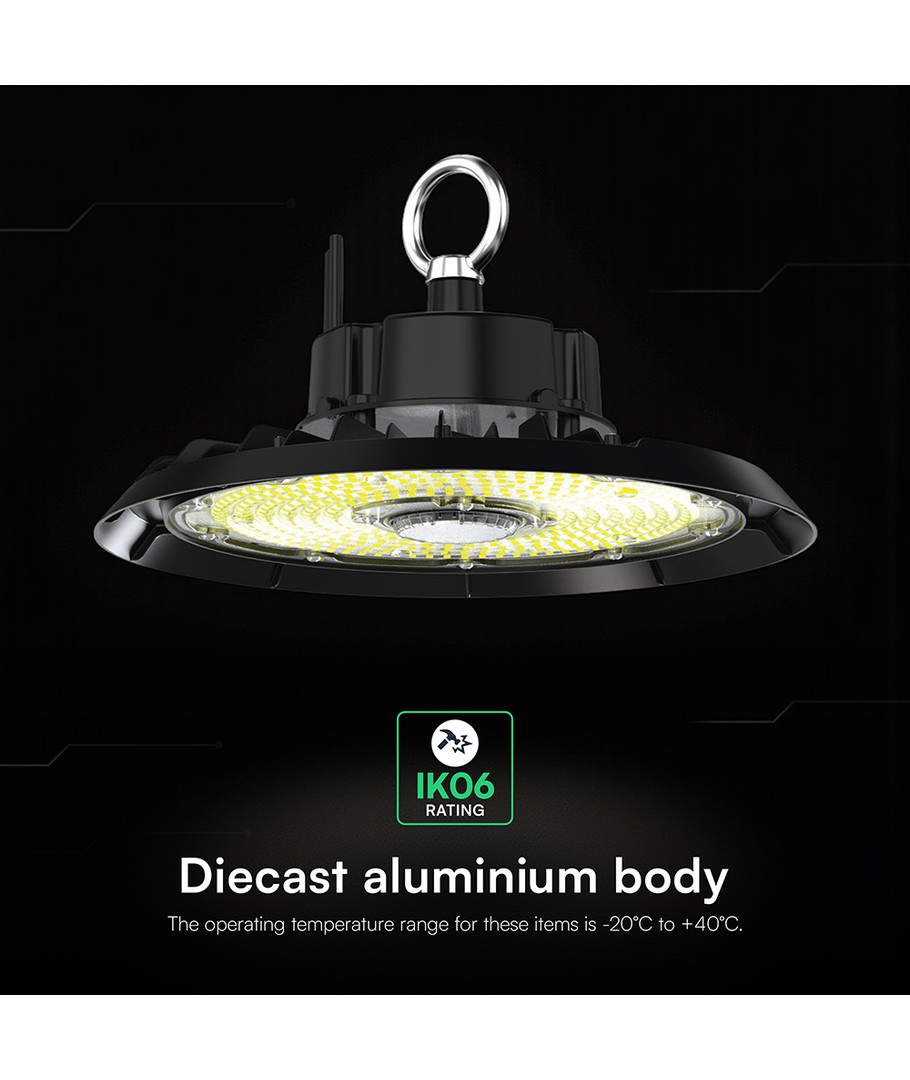 Designad med mått på 286 x 105 x 286 mm, är denna highbay-lampa praktisk att installera och använda i olika miljöer. Den är IP65-klassad, vilket innebär att den är lämplig för utomhusbruk och tål vattenstänk samt regn.