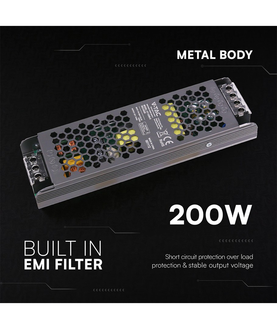 200W / 12V DC strömförsörjning för LED-strips - erbjuder pålitlig och effektiv strömkapacitet i en slimmad design.