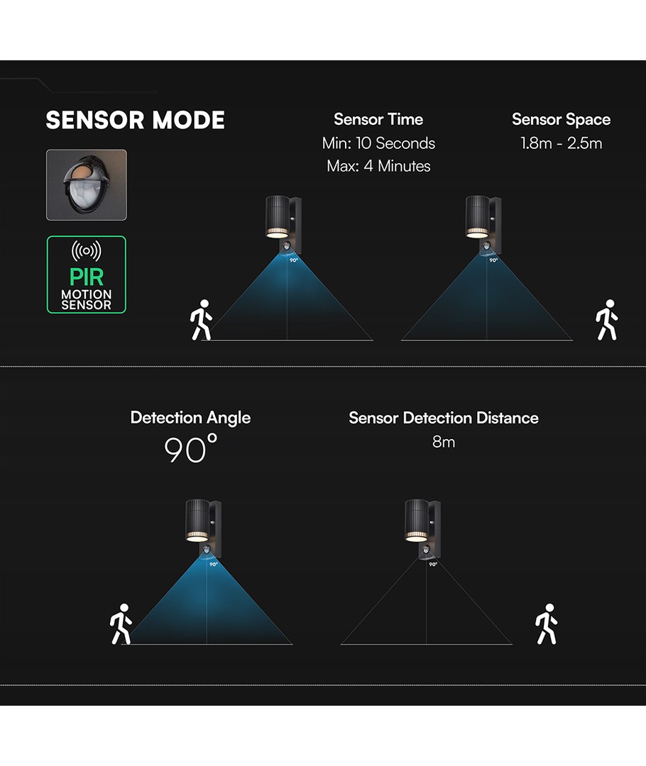 | Yderligere bemærkninger | Sensor type: PIR. Sensor angle: 90°. Sensor distance: 8 Meters. |