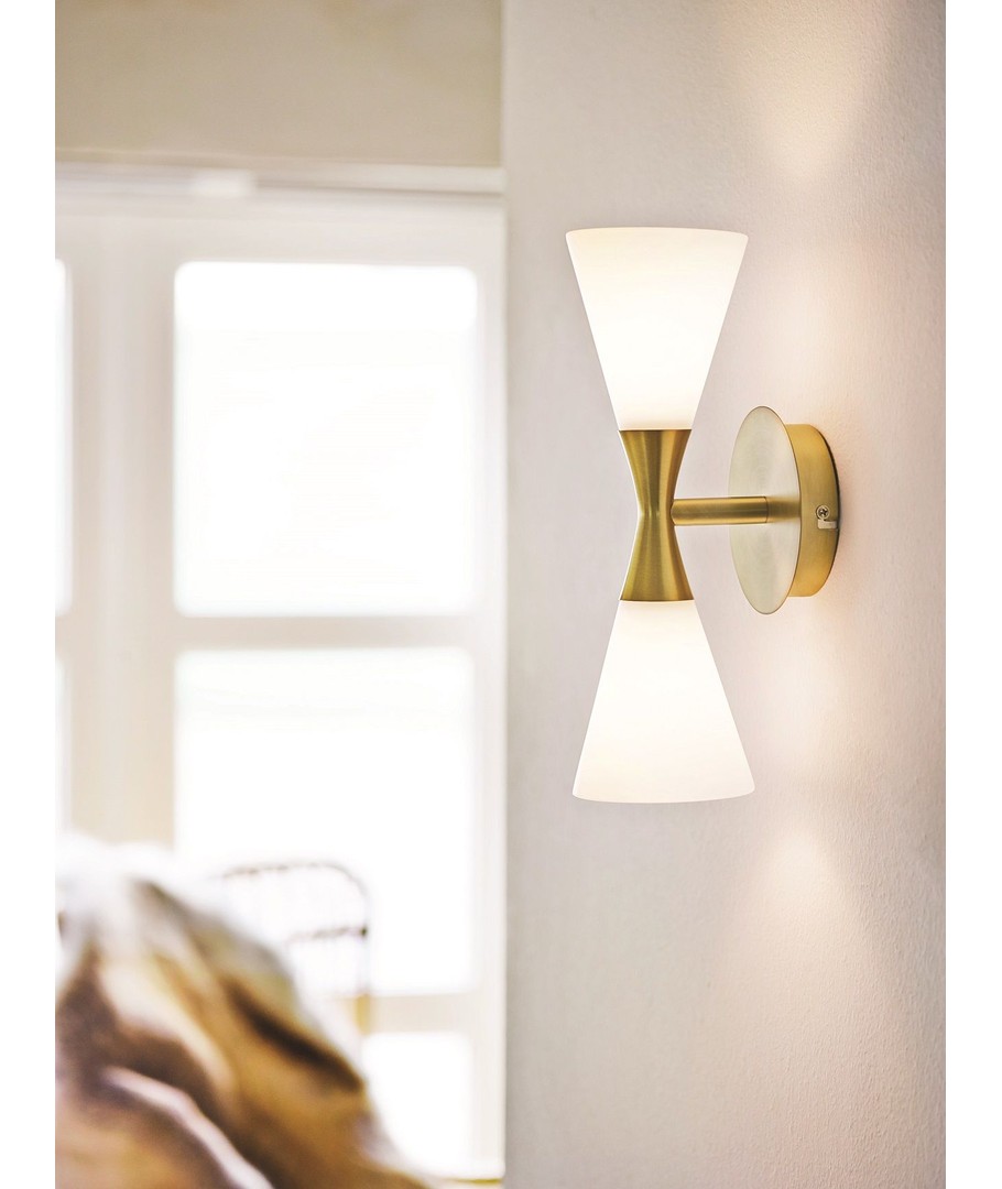 Harlekin Duo er en elegant og stilfuld væglampe. Det flotte design giver et blødt op og ned lys, der passer perfekt ind i din hall. Lyskilder medfølger ikke.