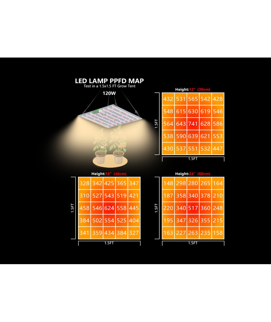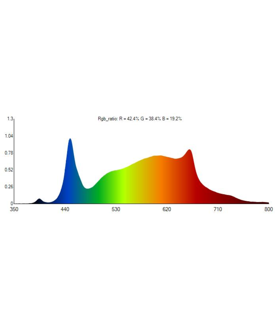 | PAR (center värde): | 620 ppfd 30cm 580 ppfd 45cm 410 ppfd 60cm |