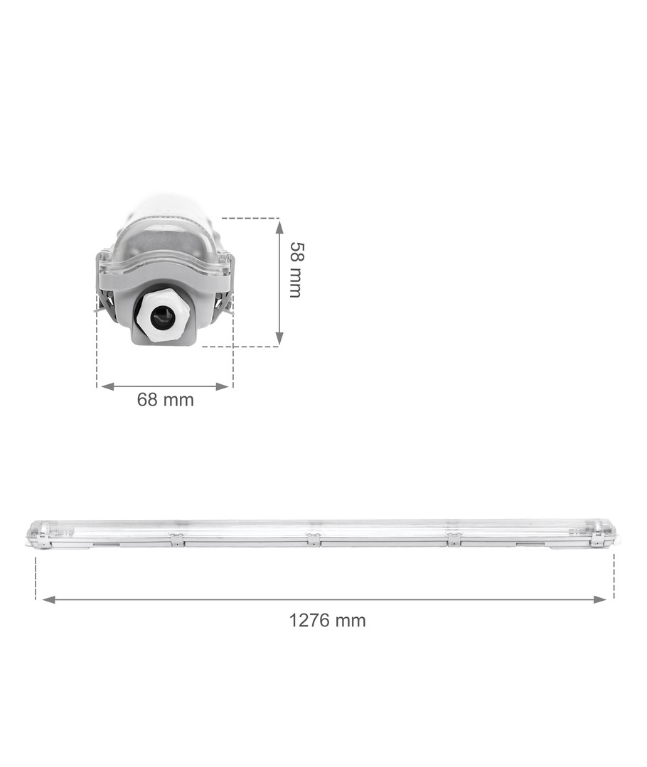 Anslut till 230V: Enkel installation med strömanslutning via standardspänning, vilket gör den kompatibel med de flesta elnät. Dimensioner: Armaturen har måtten 1276 x 58 x 68 mm, vilket medför en diskret men samtidigt effektiv ljusspridning i olika miljöer.Denna armatur är utformad för att klara av olika miljöförhållanden, vilket demonstrerar dess mångsidighet och hållbarhet.